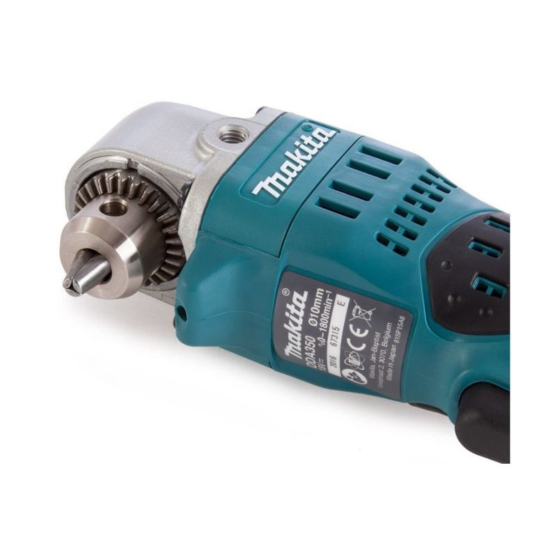 Привод угловой дрели Makita DDA350Z имеет 4-х полюсную конструкцию, что обеспечивает повышенную энергоэффективность при меньших габаритах и весе. Скорость у него регулируется от нуля при увеличении давления на выключатель. Максимальное значение – 1800 об/мин., и ещё у двигателя этой дрели есть два очень полезных потребительских свойства. Это - наличие электрического тормоза и возможность реверсивного вращения. Это не только удобно при извлечении застрявшего сверла, но и позволяет использовать инструмент в качестве шуруповерта.