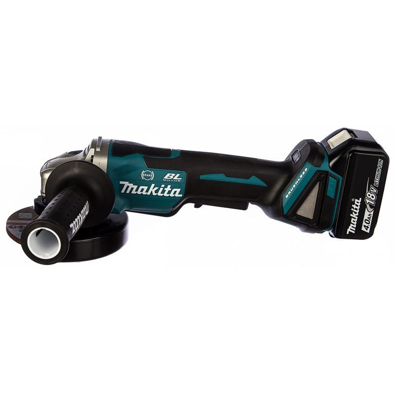 Болгарка для автономного применения. Диск 125 мм, вес 2,6 кг, длина 362 мм. Плавный пуск, электрический тормоз, защита от обратного удара. Два аккумулятора литиевых 18 В емкостью 4Ач, зарядное устройство.