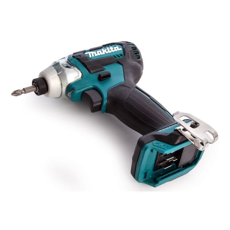 Как любой шуруповерт, инструмент Makita TD111DWAE имеет переключатель реверса и электрический тормоз привода. Патрон у этого агрегата – под стандартные биты, есть у него и крючок для крепления на ремне. Светодиодная подсветка включается традиционно – при нажатии на курок, и имеет послесвечение 10 секунд после его отжатия. Это время можно сократить, воспользовавшись кнопкой в основании инструмента.