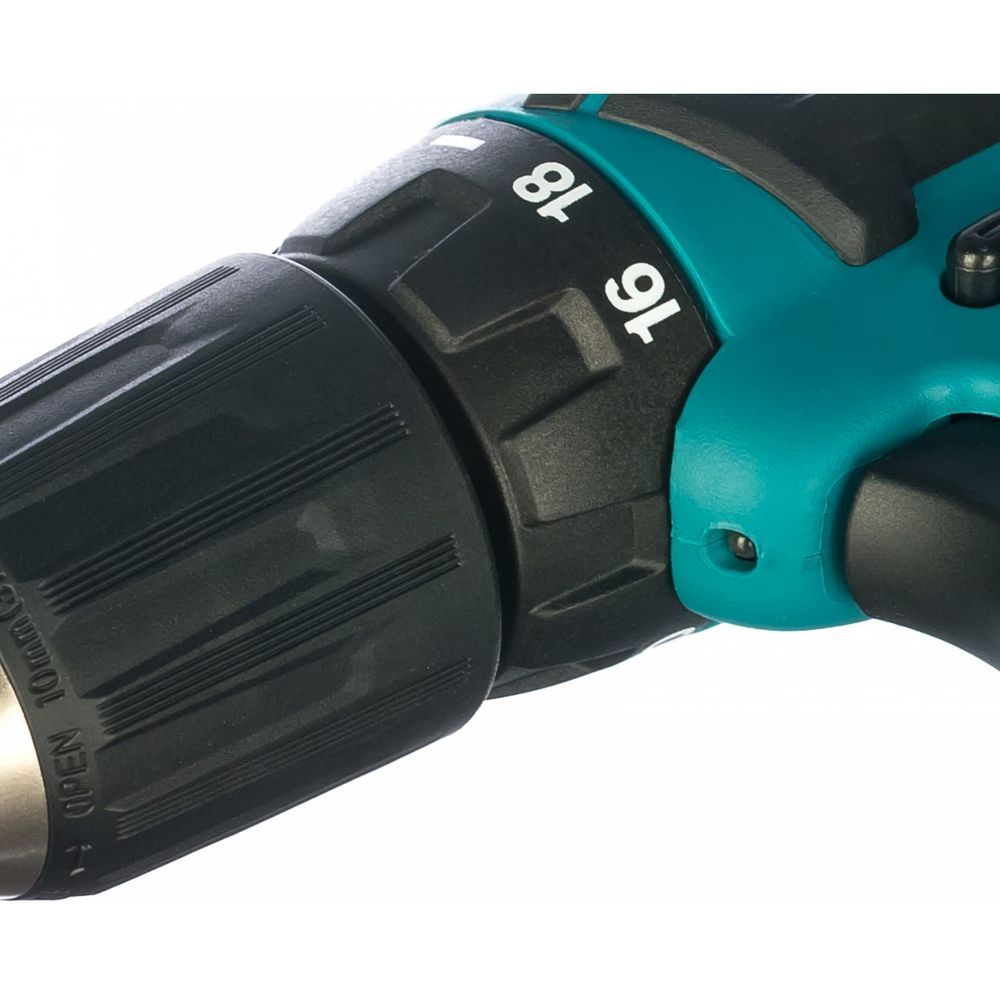 Перевод дрели Makita DF331DWYE4 в режим шуруповерта осуществляется с помощью кольца настройки крутящего момента. В этой модели его можно изменять очень гибко, в 18 градациях и в диапазоне от 14 до 30 Нм. Таким образом, пользователь без труда подберет оптимальное значение для крепежа диаметром от М4 до М6 или для шурупов длиной до 63 мм.