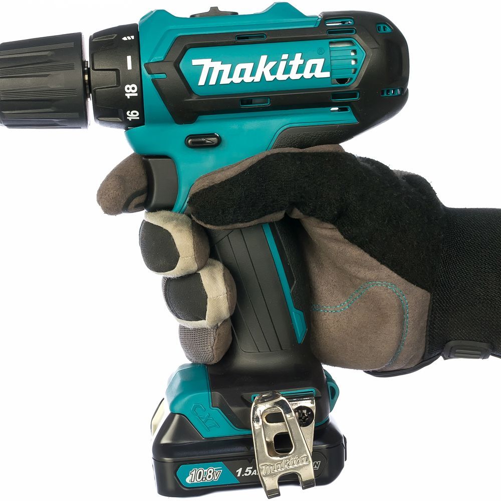От этого зависит и полный вес дрели-шуруповерта Makita DF331DWYE4, находящегося в диапазоне от 1100 до 1300 грамм. При длине всего 18,9 см этот инструмент кажется миниатюрным, несмотря на приличные возможности, описанные выше. В инструкции по эксплуатации показано, как легко этот агрегат переносится на поясном ремне. Для этого в дрели имеется съемный крючок, который можно установить с любой стороны.
