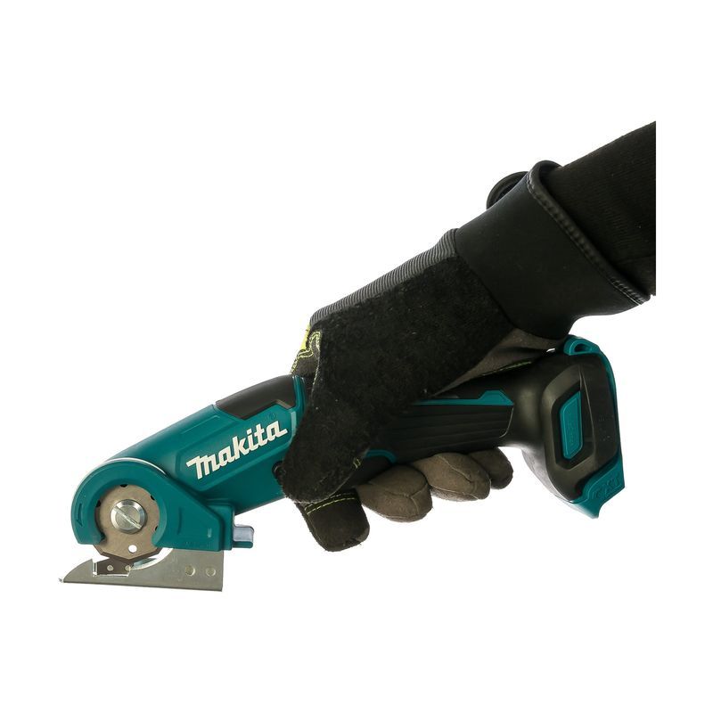 Резка материала ножницами Makita CP100DZ выполняется путем их перемещения вперед. Рабочий элемент – диск, вращающийся со скоростью 300 об/мин. Каких-либо особенностей по применению этого инструмента нет, следует только помнить, что тонкий материал обязательно должен быть натянут.