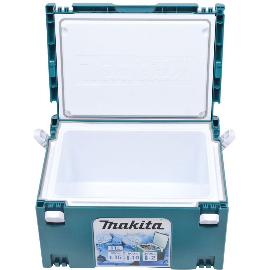 Технология MakPac, используемая компанией Макита в инструментальных ящиках, получила в 2018 году развитие. На её базе сделана пара изделий, выполняющих весьма полезную функцию. Одно из них, в фирменном формате размера L – это термобокс Makita 198254-2, имеет объем 11 литров. Это эквивлентно месту для хранения десяти поллитровых бутылок или пары стандартных двухлитровых емкостей.