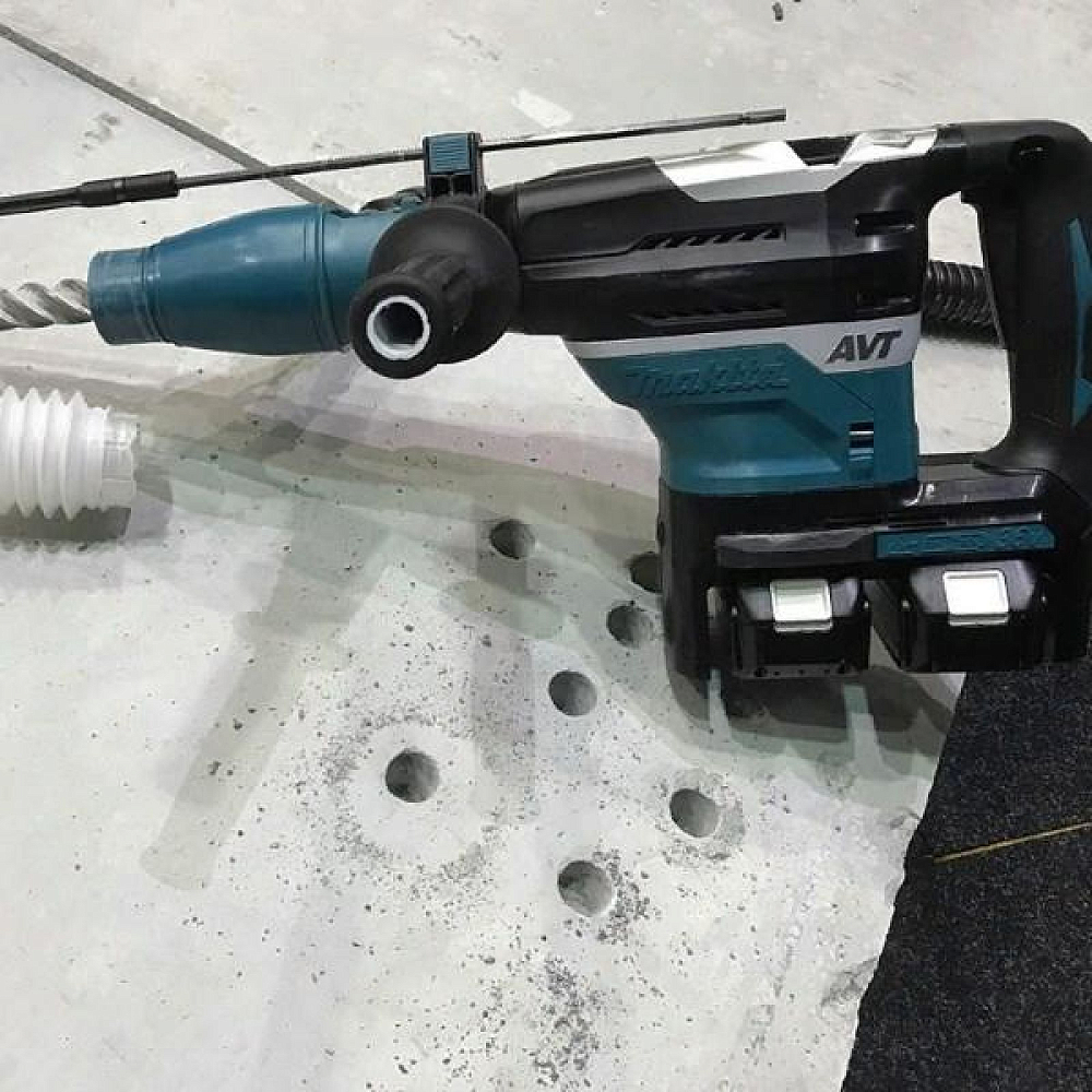 Использование двух аккумуляторов в этом инструменте говорит о повышенном напряжении питания его привода. Действительно, в представленном рынку в 2018 году перфораторе Makita DHR400ZK его значение достигает 18+18=36 Вольт. Это определяет рекордную для агрегатов этого класса энергию удара – 8 Дж, и им можно сверлить отверстия в бетоне диаметром до 105 мм, если использовать коронку. Диаметр отверстий при работе обычным буром – до 40 мм.