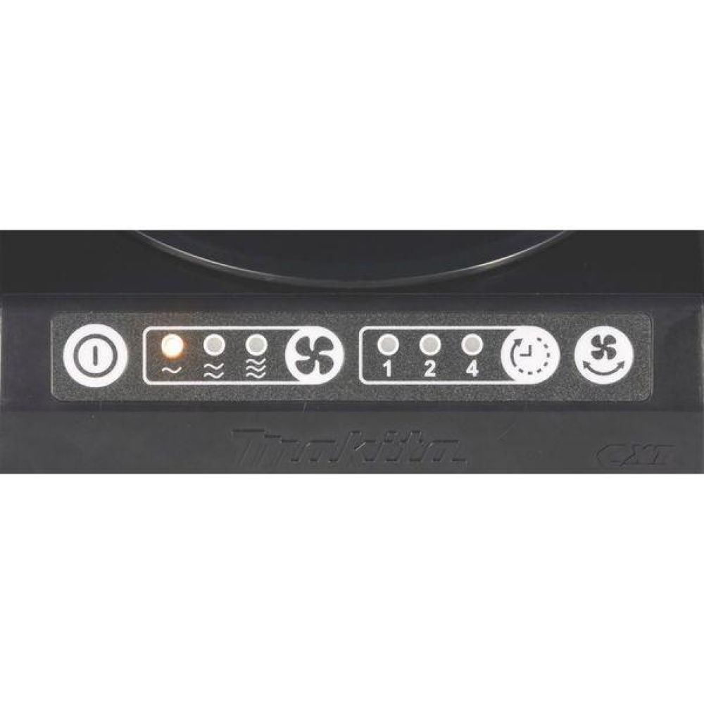 Вентилятор  Makita CF101DZ оснащен панелью управления с рядом кнопок и индикацией. Включение и выключение производится одним переключателем, отдельная кнопка используется для управления скоростью. Её значение меняется от 2 до 3 м/сек при последовательном нажатии. Ещё один элемент управления – включение режима автоматического качания. Угол наклона при этом варьируется в диапазоне 90 град.