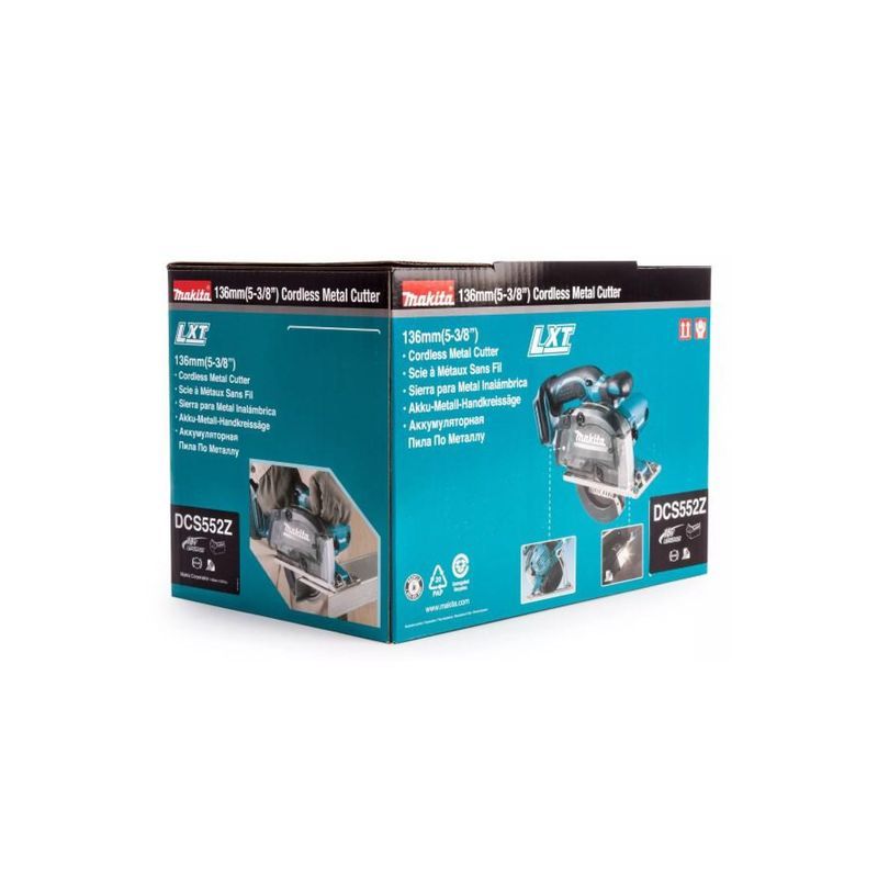 Энергетические возможности агрегата позволяют использовать его для резки мягкой стали – достточно установить соответствующий диск диаметром 136 мм. В комплект поставки пилы Makita DCS552Z он не входит, и пользователь имеет возможность подобрать требуемое режущее полотно сам. Аккумулятор при продаже этой модели тоже не предусмотрен (буква Z в обозначении), тем не менее, пользователь этого агрегата получает целый набор важных преимуществ: