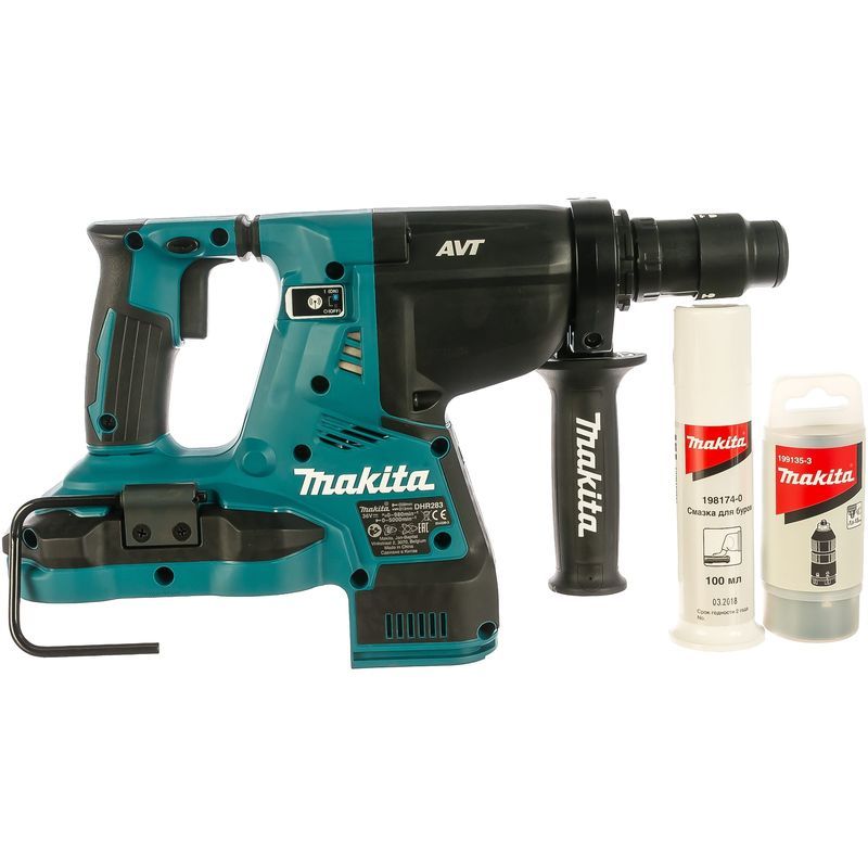 Она тоже имеется в комплекте поставки перфоратора Makita DHR283ZJ, а установить её можно в любом положении. Боковая ручка не будет лишней при длине агрегата 40,4 см и весе от 3,9 до 5,1 кг. Последний параметр зависит от емкости установленных аккумуляторов, которая может быть любой – от 1,5 до 6 А-час. Батареи обеспечены трехступенчатой защитой – от токовой перегрузки, перегрева и недопустимого разряда.