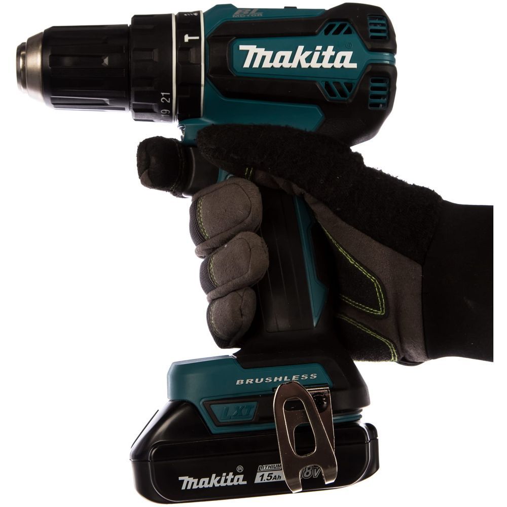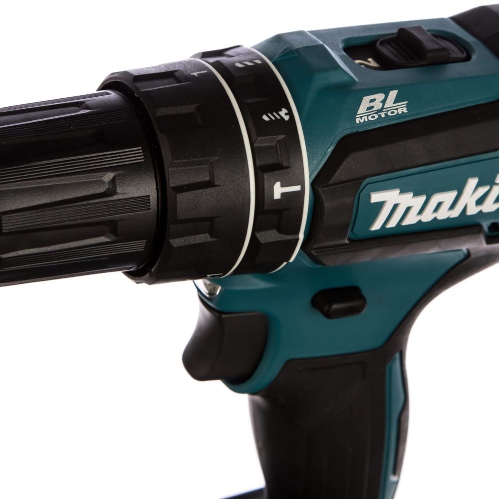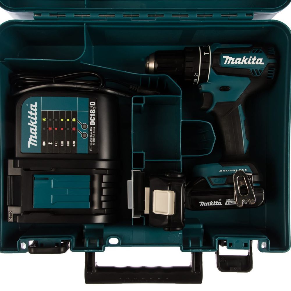 Поставляется инструмент Makita DHP485SYE в кейсе, в котором дополнительно уложены пара аккумуляторных блоков емкостью 1,5 А-час и зарядное устройство к ним. Это означает, что пользователь может использовать агрегат непрерывно, не дожидаясь готовности разряженного аккумулятора. Для увеличения длительности работы к дрели можно присоединить и другой блок серии BL18XX емкостью до 6 А-час.