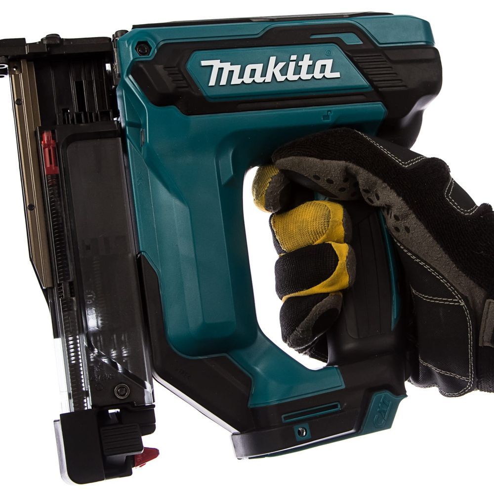 Защищен и пользователь гвоздезабивателя Makita PT354DZ. Триггерный переключатель снабжен кнопкой блокировки, исключающей случайное нажатие на него. Механизм забивания срабатывает только при касании заготовки специальным контактным элементом. Блокируется инструмент и тогда, когда в магазине не остается гвоздей. Их количество можно проверить и через смотровое окно.