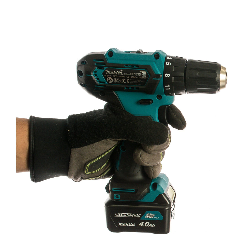 Он расположен в нижней части рукоятки. Перечень удобств для пользователя дрели-шуруповерта Makita DF333DWME можно и продолжить. Её конструкция позволяет не только установить крючок для переноски с любой стороны рукоятки. Инструмент можно поместить в специальную кобуру.