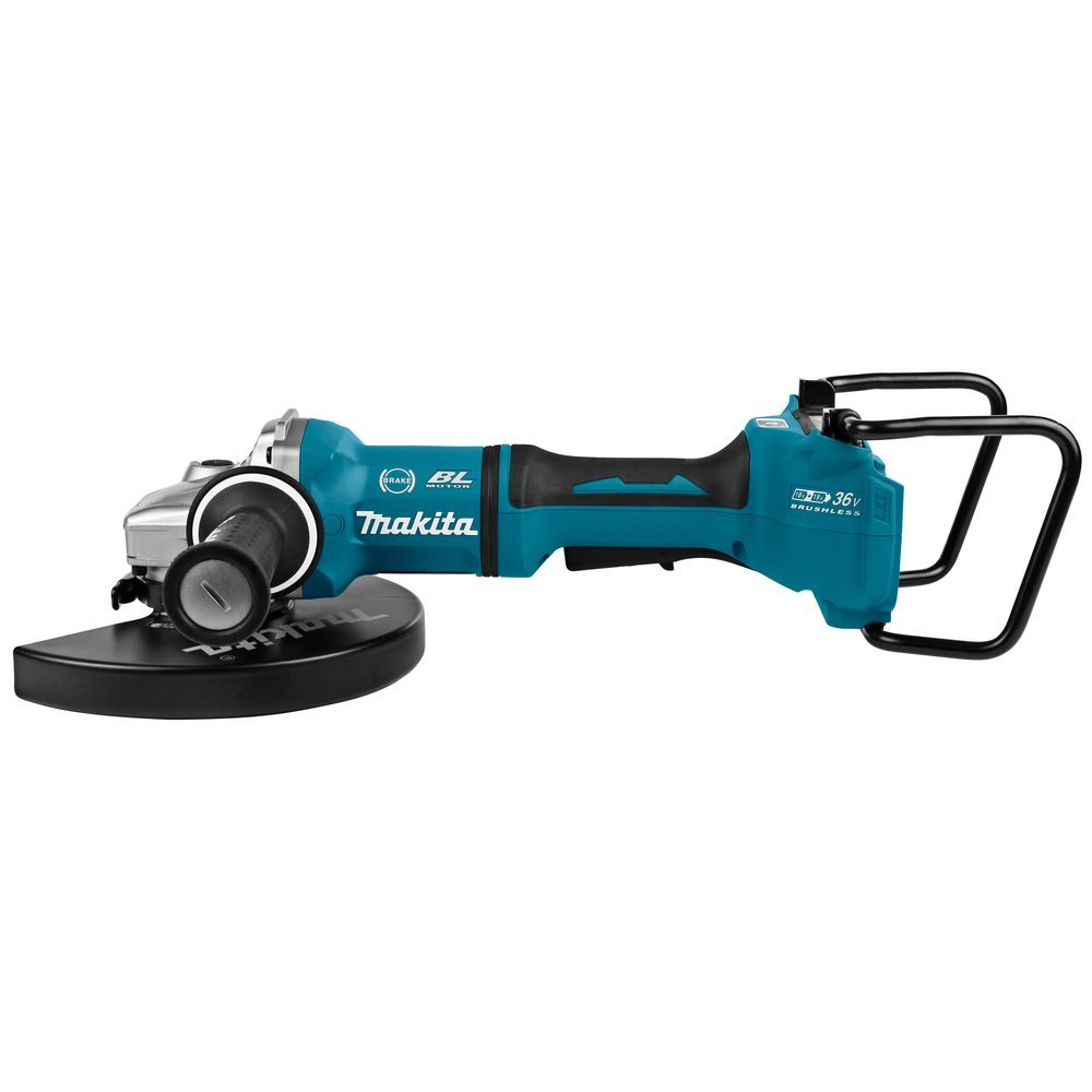 Аккумуляторная болгарка под диск 230 мм. Питание - 2 слайдера BL18XX - в комплект поставки не входят. Плавный пуск, электрический тормоз, автоматический крутящий момент, защита привода от защемления диска. Длина 499 мм, вес не более 6 кг